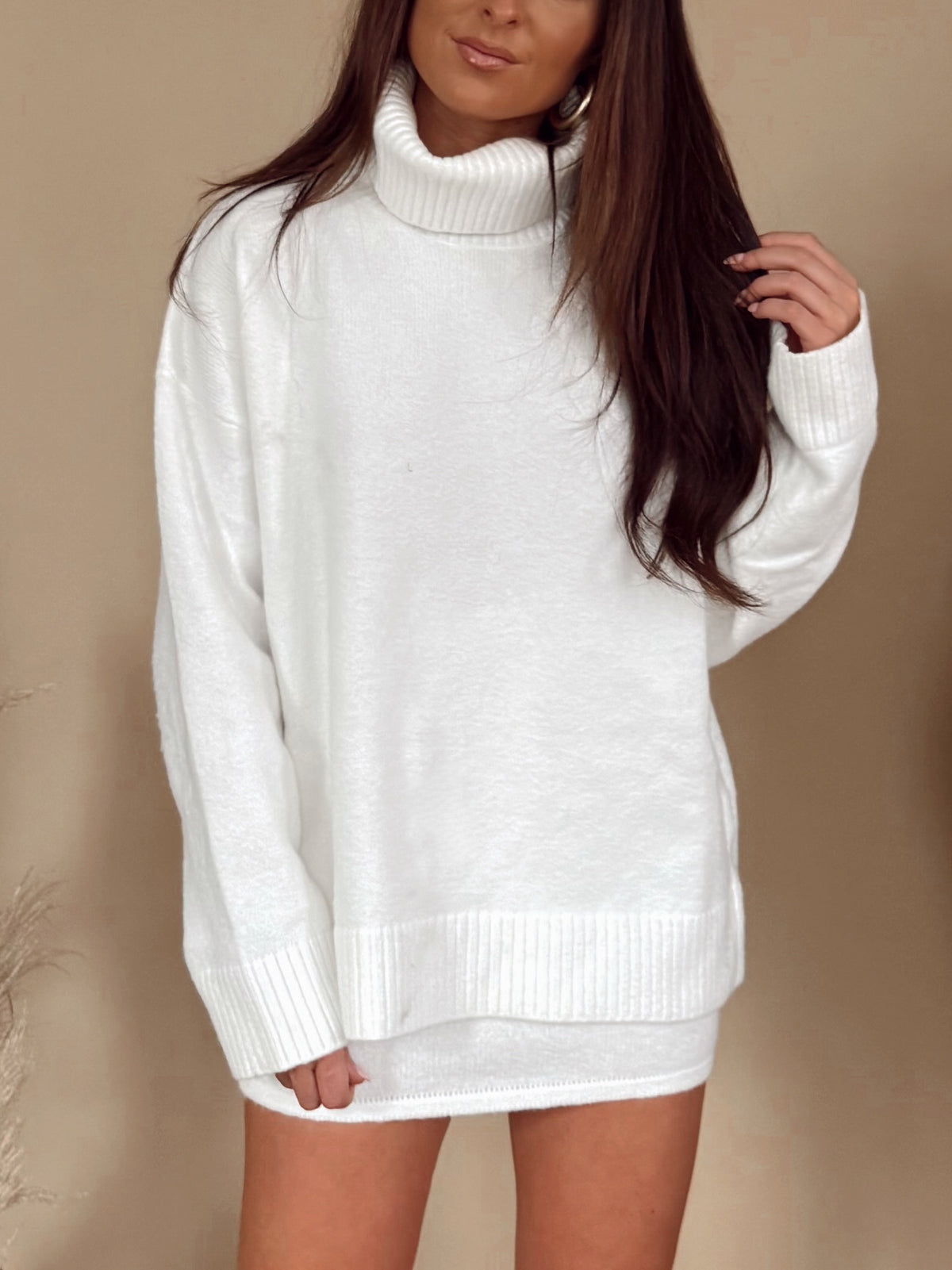 The Payton Set is a two piece set featuring an ivory turtleneck sweater and skirt.