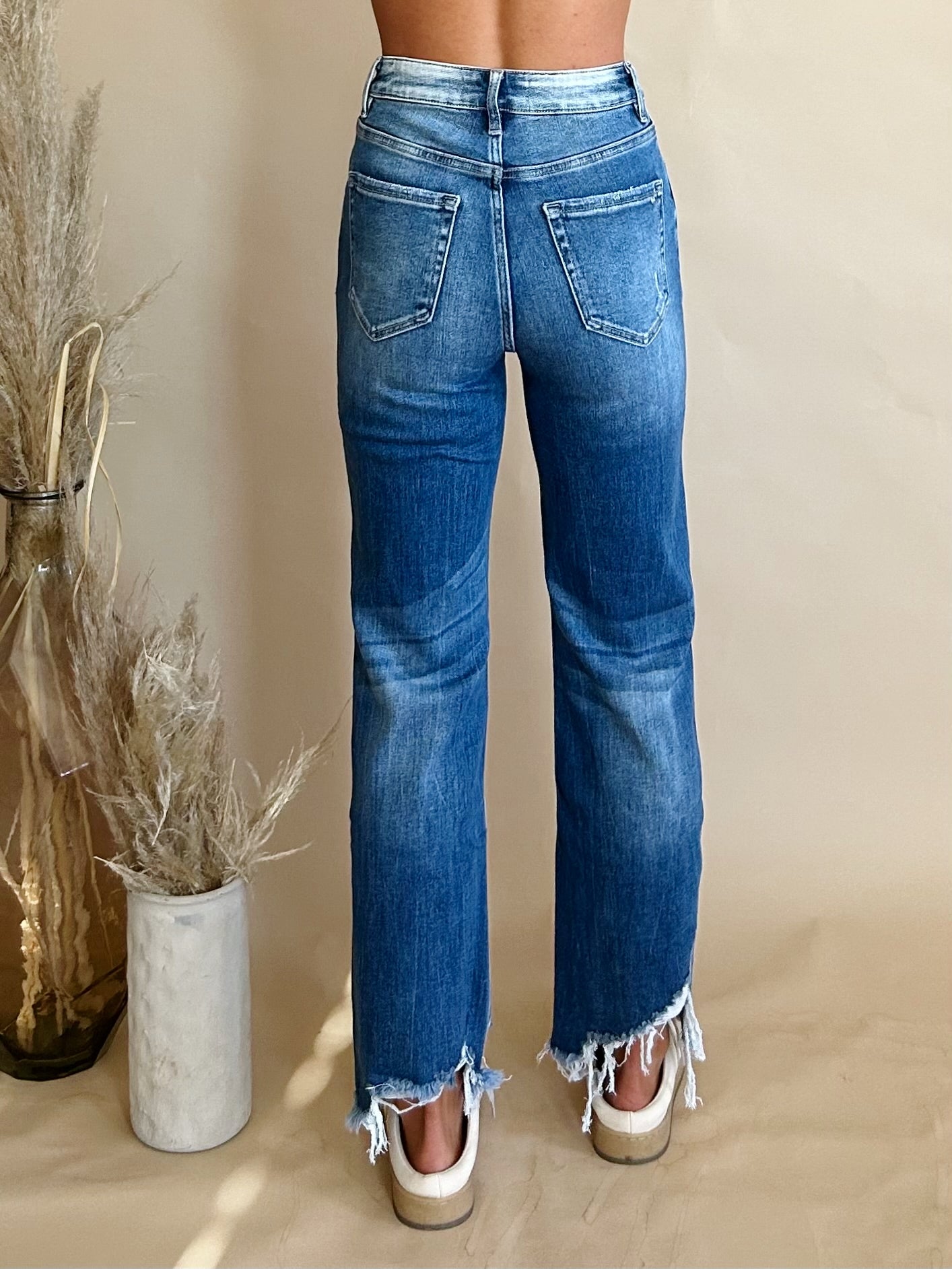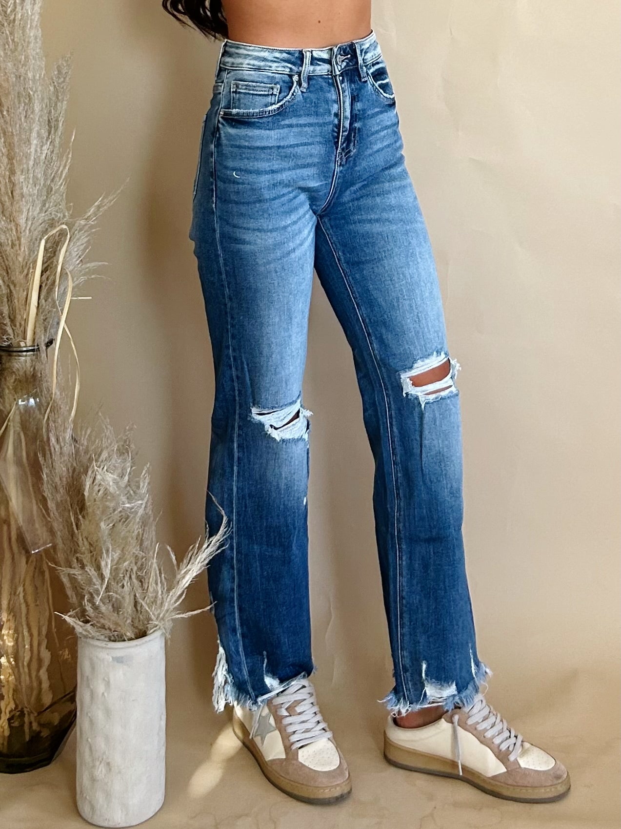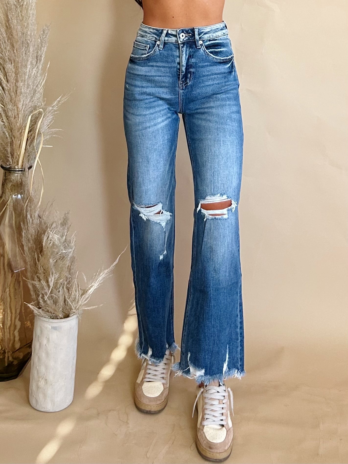 The Angela Jean is a medium wash, super high rise, wide leg jean with distressed knees and bottom.