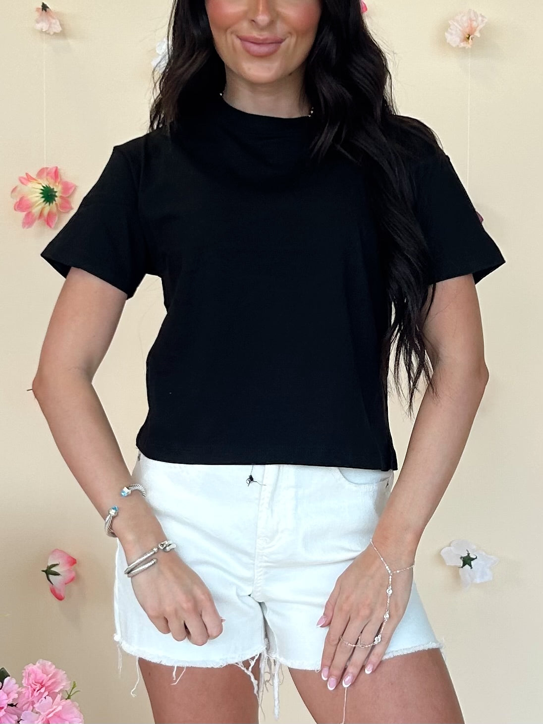 The Beckham Top is a cotton t-shirt featuring a crew neck and cropped fit.