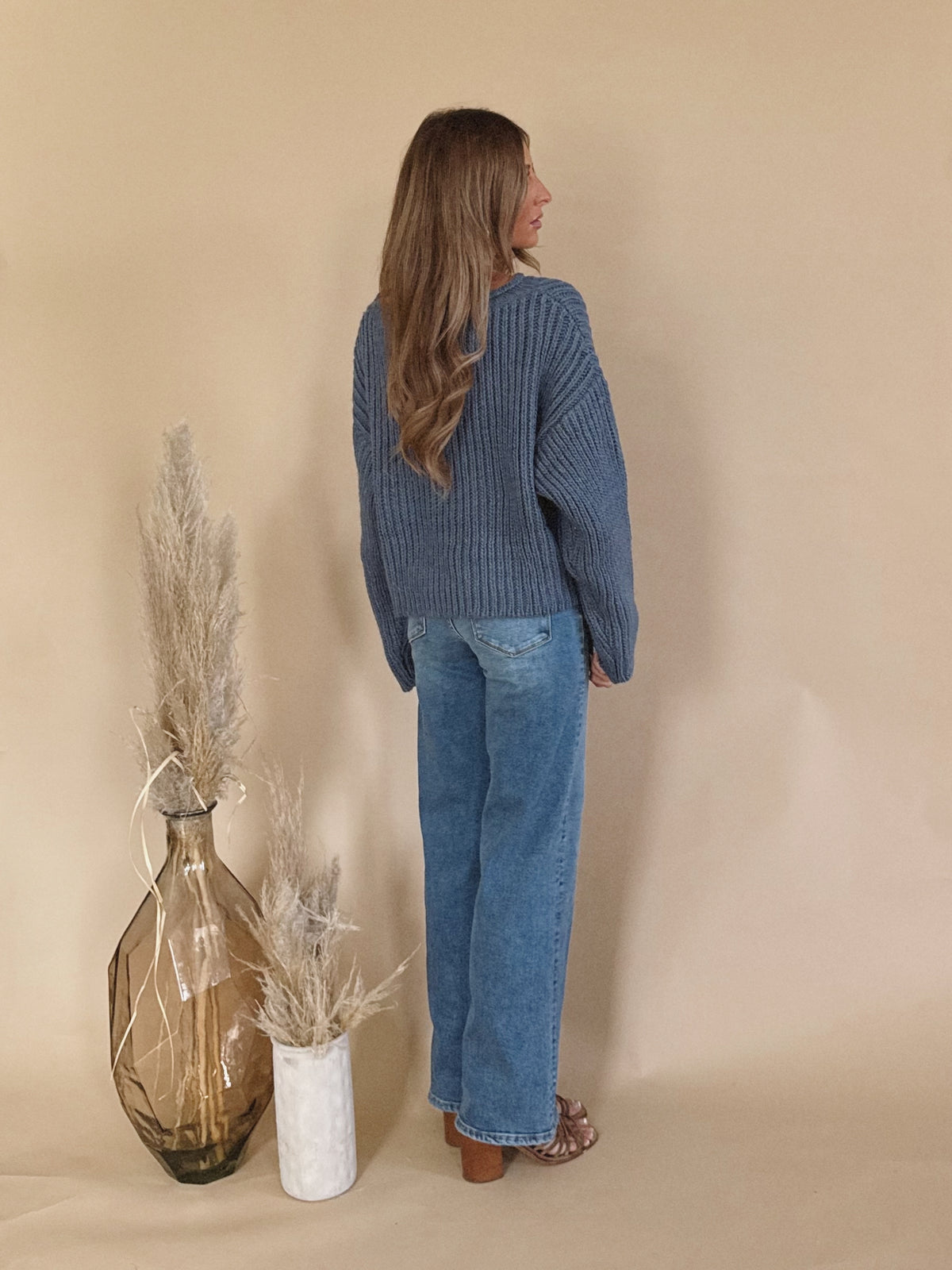 The Chloe Sweater is a slouchy blue knitted sweater with a small bell sleeve.