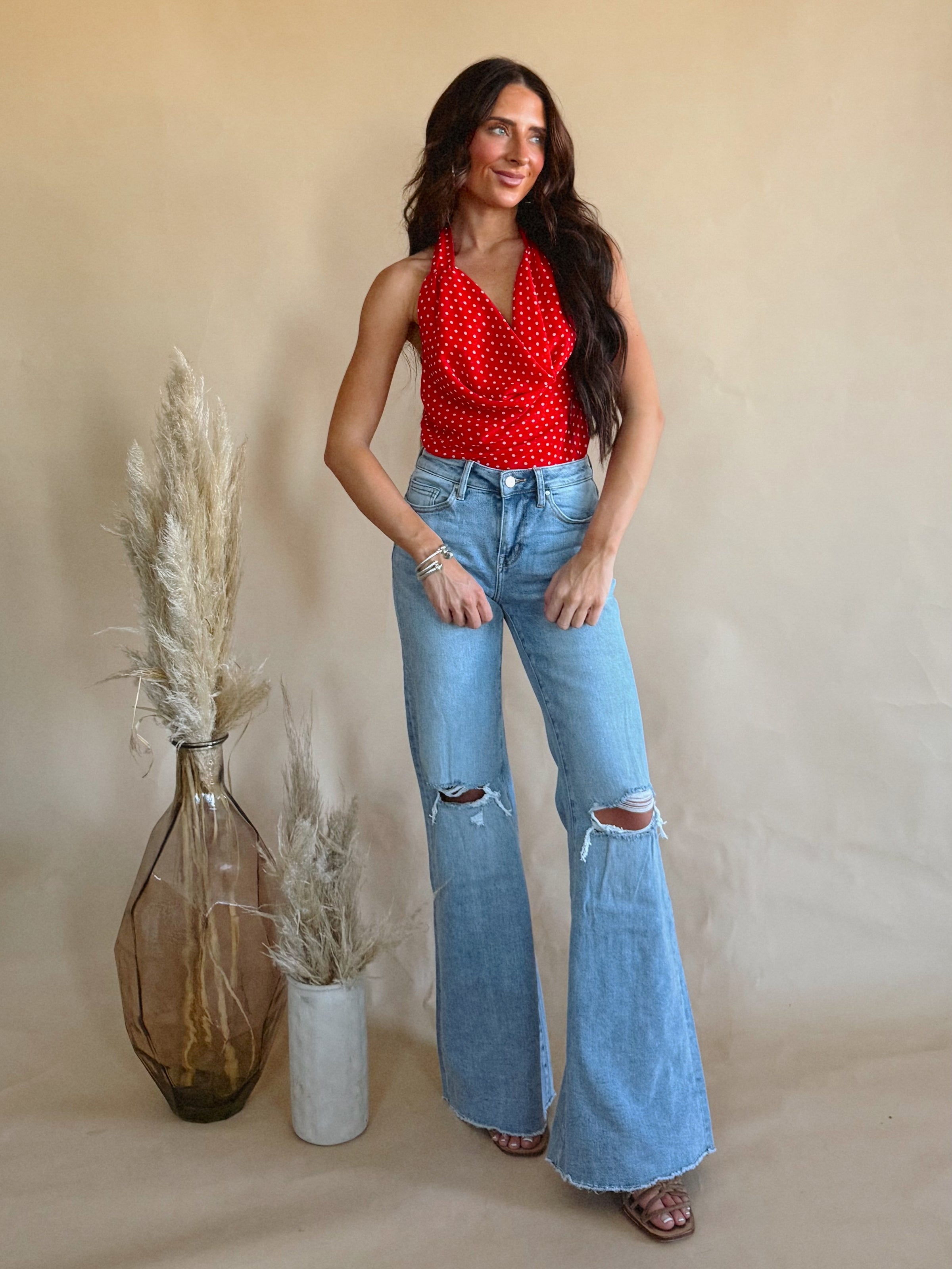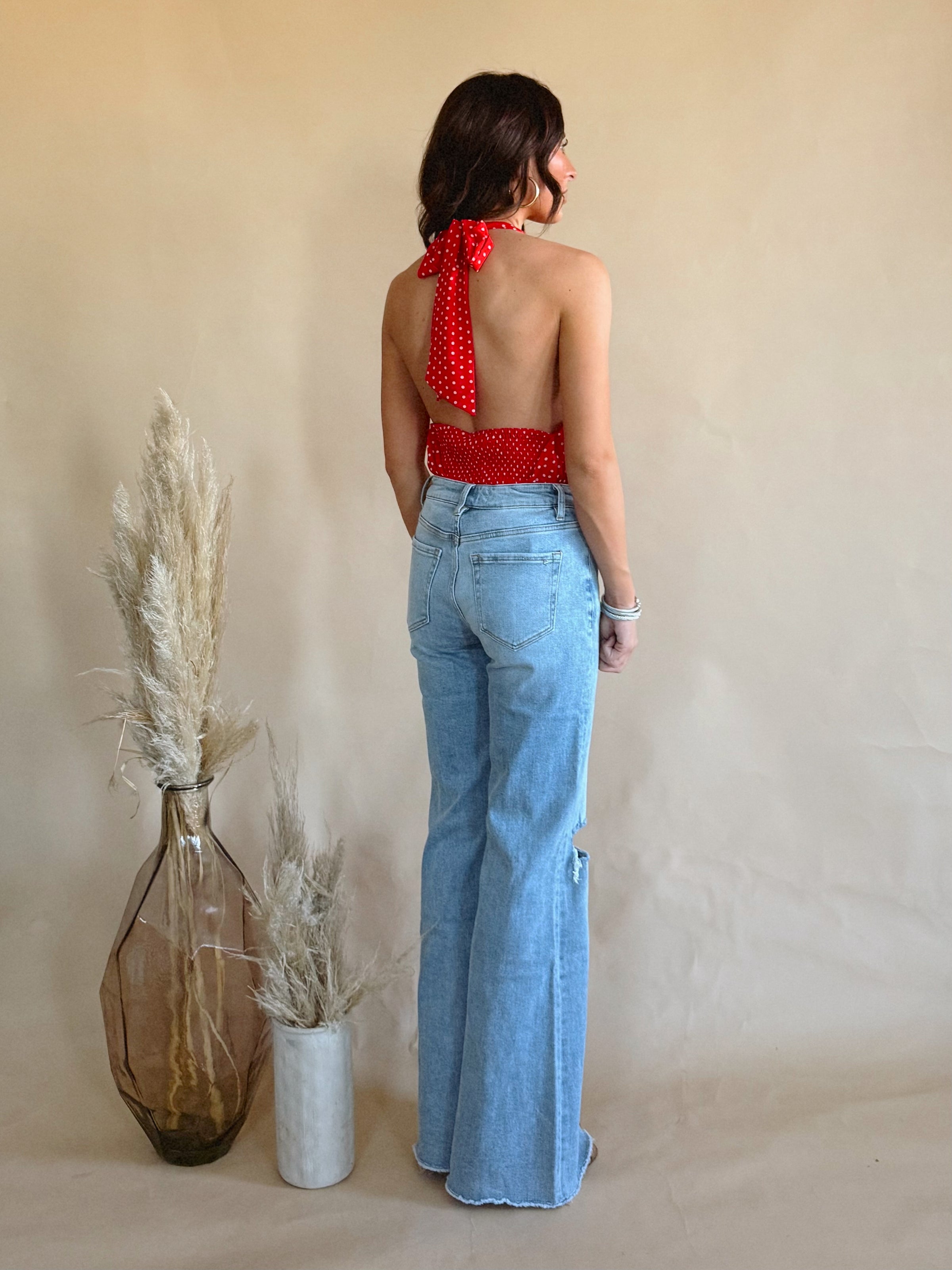 The Dottie Top is a red polka dotted halter neck top with an open back.