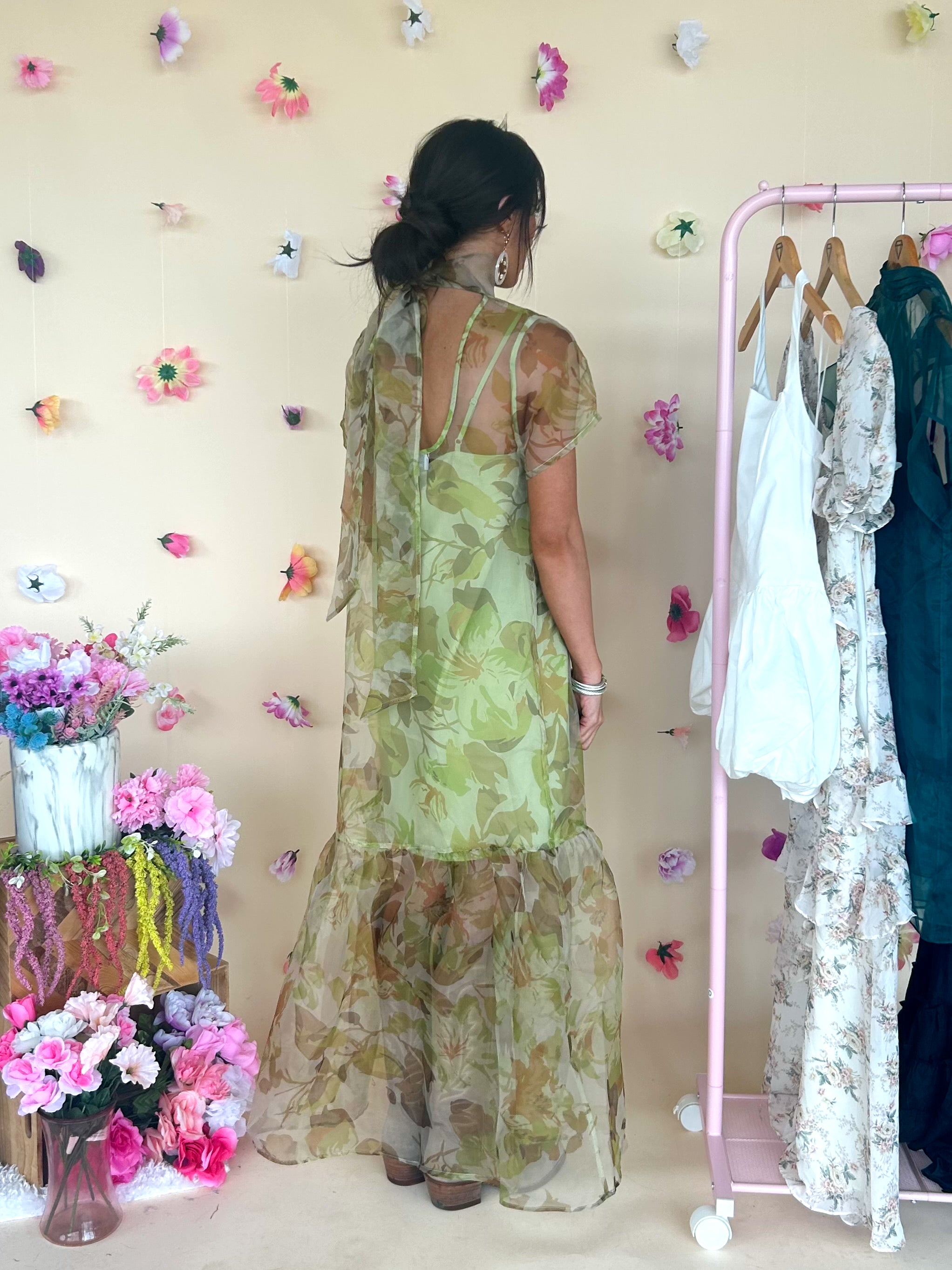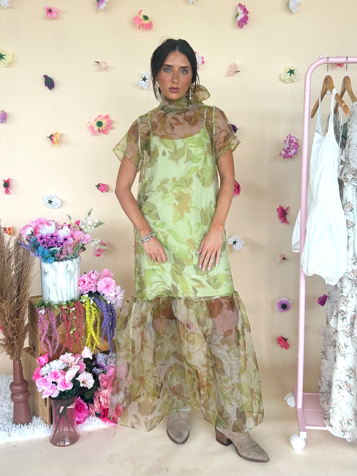 The Farrah Dress is a green floral maxi dress with a sheer overlay and a high neck ruffle bottom.