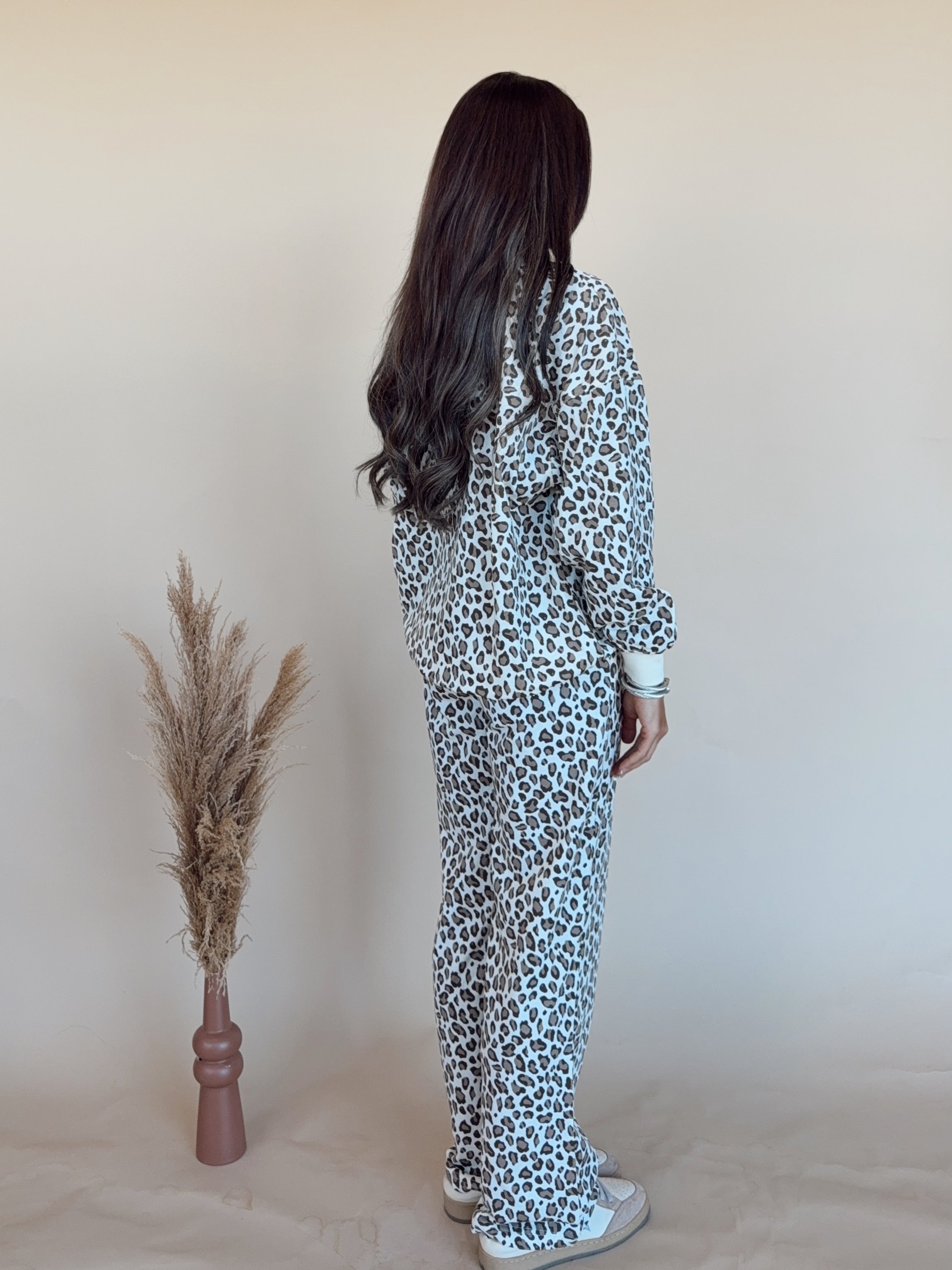 The Gina Set is a leopard long sleeve two piece set with a pink bow detail on the top and bottom.