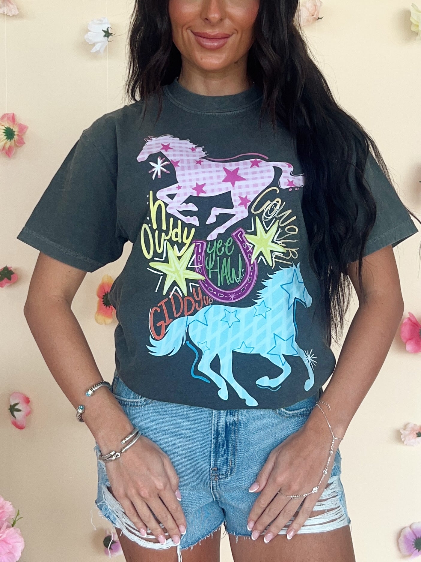 The Howdy Cowgirl Tee is a comfort color tee with colorful wording and western graphics.