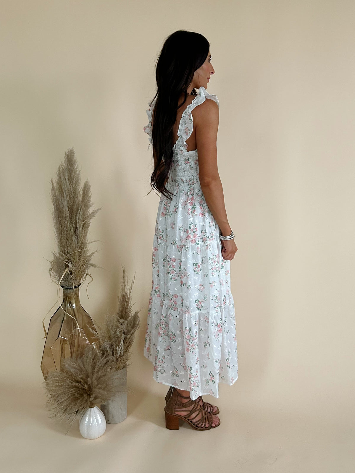 The Kennedi Dress is a floral dress with ruffled straps, a smocked bodice, and a mid length fit.