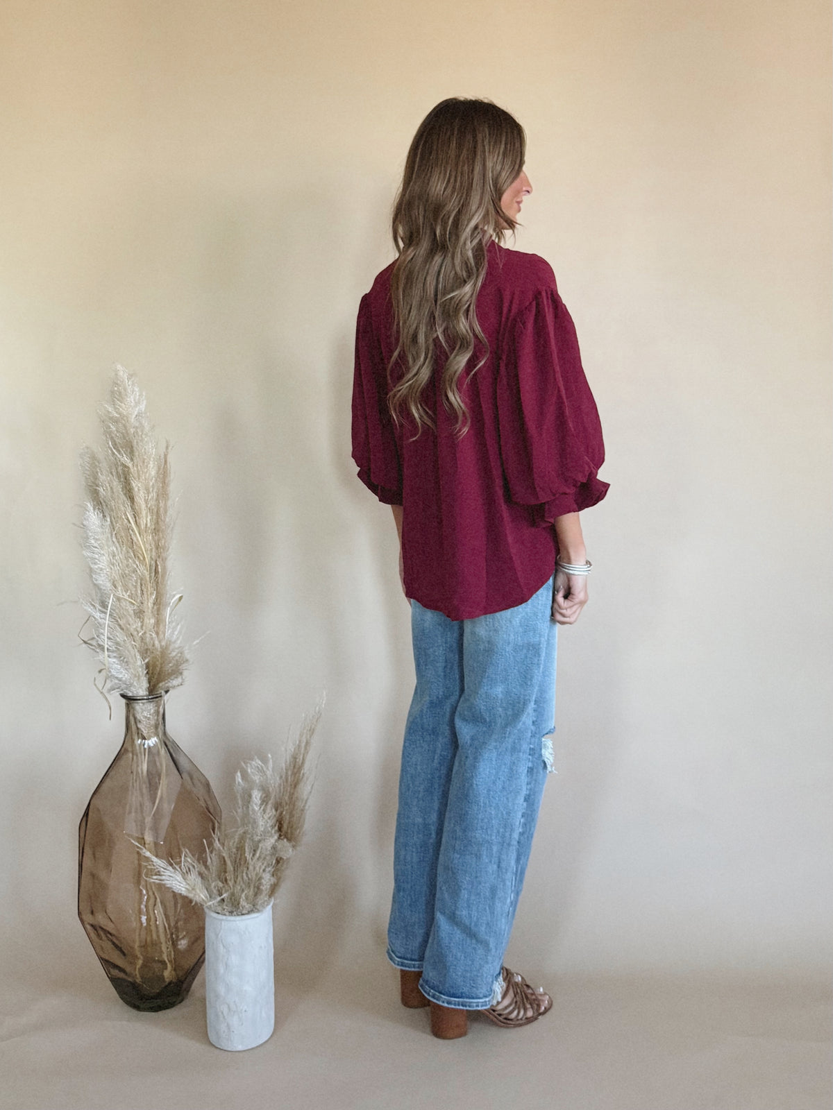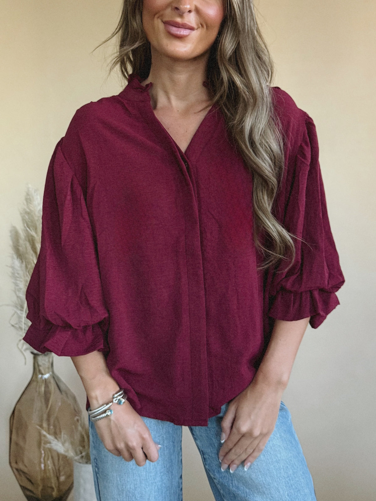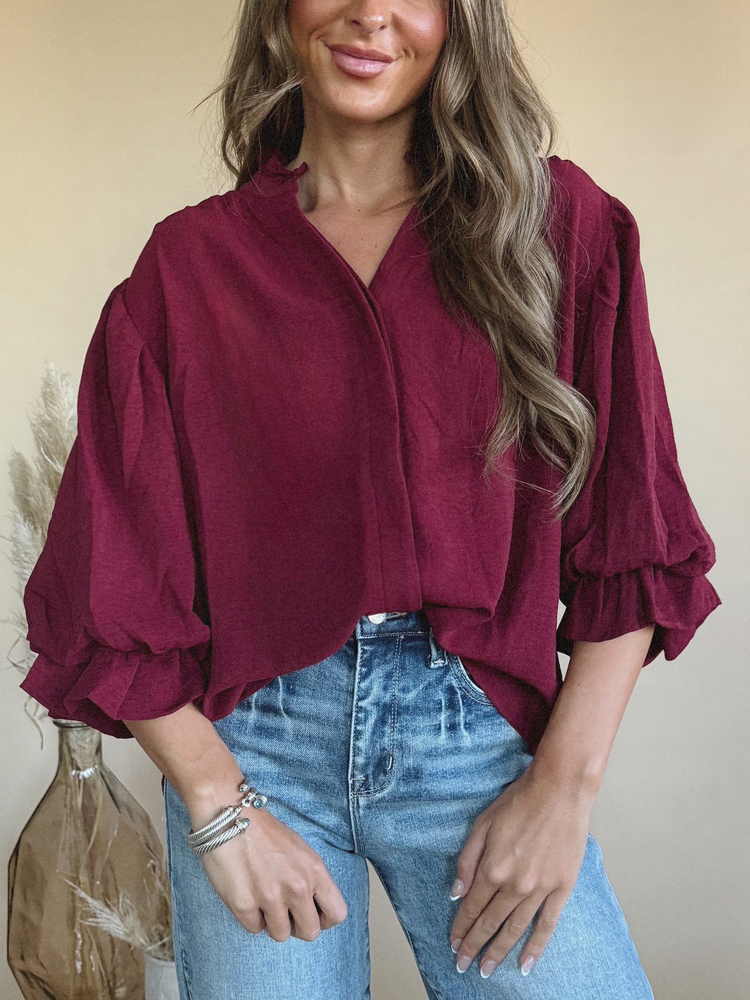 The Kennedy Top is a loose fitting blouse with a ruffle sleeve detail and v-neck.