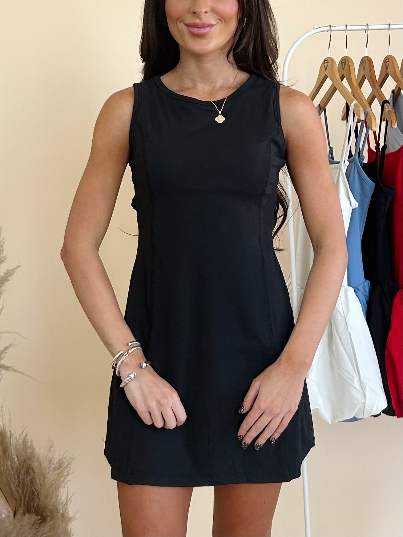 The Poppy Dress is a round neck sleeveless athletic dress with a back cut out and shorts built in.