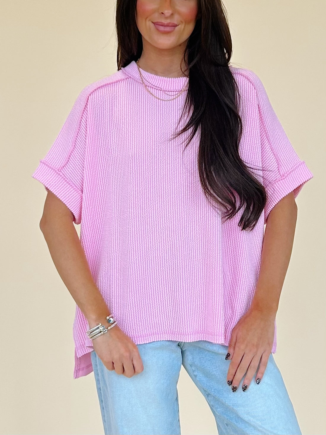 The Sara Top is a Wavy Corded Raised Ribbed Cuff Sleeve Raw Edge Top