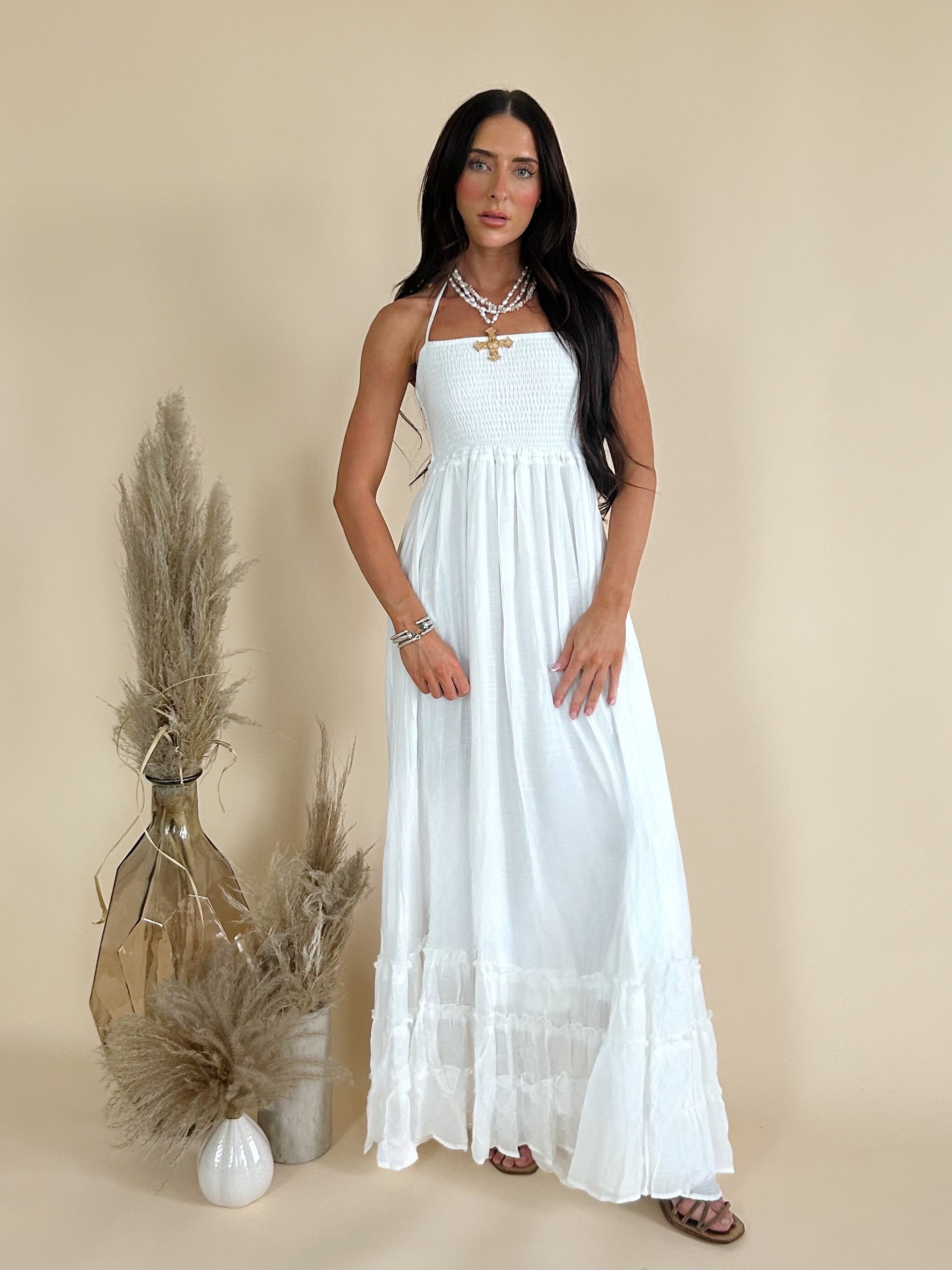 The Tabbots Dress is a white maxi dress with a halter neck, low cut back, smocked bodice, and ruffle detail.