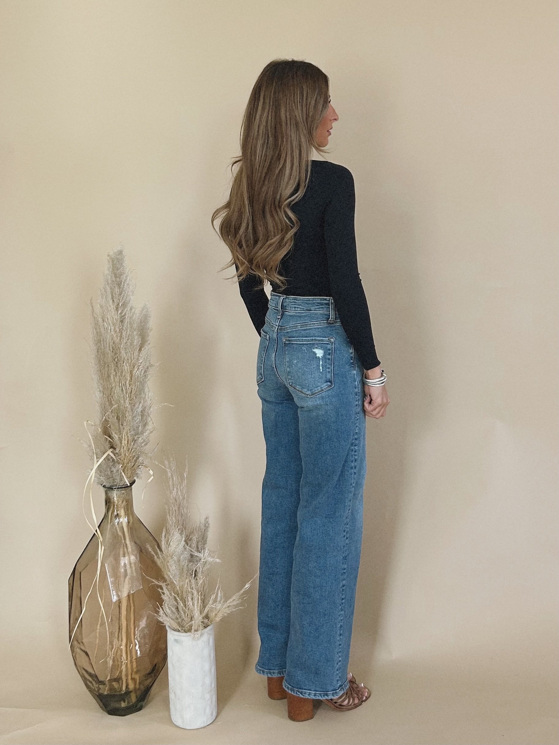 The Wrenley Topysuit is a fitted, long sleeve black bodysuit that is perfect for layering.